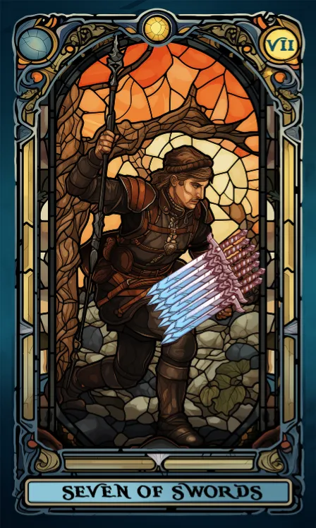 The Seven of Swords is the “sneaky bastard” card. Whether it’s someone stealing from you, lying to you, or you deceiving yourself, this card is all about dishonesty. It can also mean trying to escape a situation instead of dealing with it head-on. If this card shows up, it’s a big red flag to keep an eye on your surroundings—or take a hard look in the mirror.