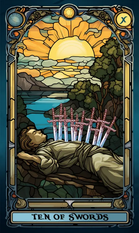 Imagine getting stabbed in the back—ten times. That’s this card. It’s the epitome of hitting rock bottom, whether through betrayal, burnout, or just life beating you down until you can’t take it anymore. The Ten of Swords doesn’t sugarcoat anything; it’s here to say, “Yeah, it’s bad. But you know what? It can’t get worse.” The only silver lining? Once you’re at the bottom, the only way is up.